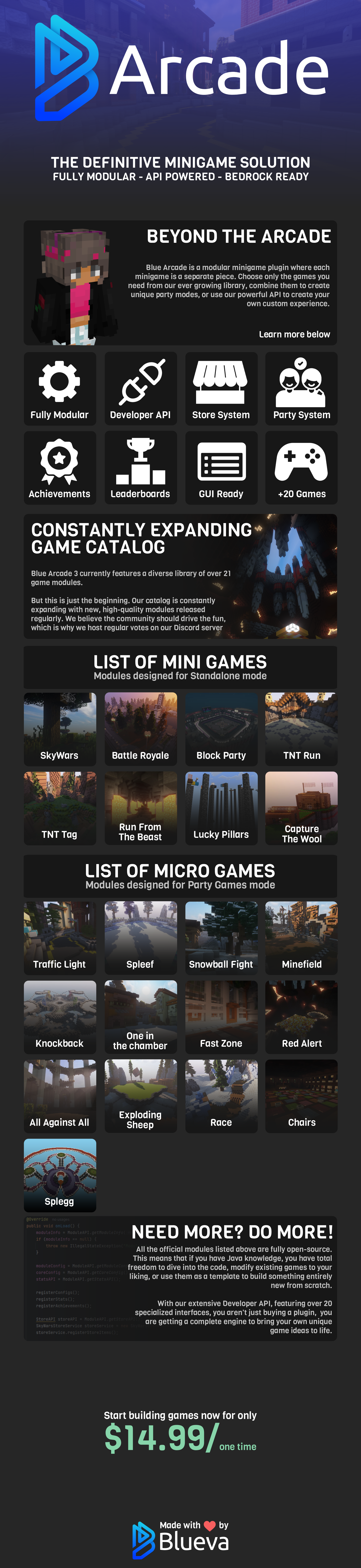 Blue Arcade is a modular minigame plugin where each minigame is a separate piece. Choose only the games you need from our ever growing library, combine them to create unique party modes, or use our powerful API to create your own custom experience.
